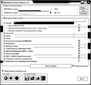 ТестыFrequencyresponse (sweptsine) иTotalharmonicdistortion (setoftones) предназначеныдлятестированияакустическихсистем. Алгоритмы тестирования акустики имеют специфику, поэтому рекомендуется использовать тесты по своему прямому назначению.