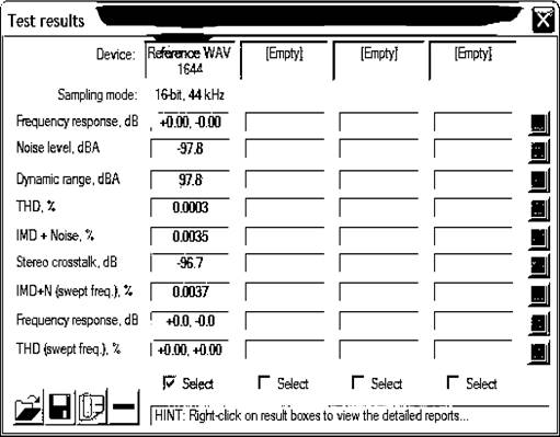 Окно поделено на 4 слота (4 вертикальных столбца), в каждый из которых могут быть записаны результаты одного набора тестов. Таким образом, можно одновременно загрузить результаты тестирования четырех устройств или четырех режимов устройств, в том числе самих тестовых файлов, сгенерированных программой. Для каждого теста в окне выводится краткий численный результат. Более подробный отчет о результатах теста можно получить, щелкнув правой кнопкой мыши на численном результате.