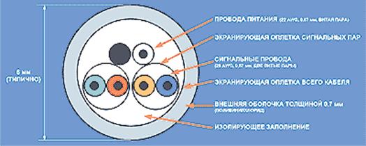 Этот кабель диаметром 6 мм содержит три витые пары проводников диаметром 0,87 мм. Одна из пар (типа 22 AWG) предназначена для питания внешней нагрузки (напряжение 8…30 В, потребляемый ток до 1,5 А), а две другие представляют собой раздельно экранированные пары сигнальных проводов типа 28 AWG. Все проводники с изолирующим заполнением заключены в экранирующую фольгу и оболочку из поливинилхлорида. Таким образом, кабель имеет сложную конструкцию и изготовить его самостоятельно вряд ли возможно.