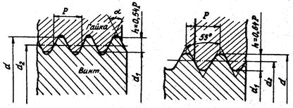 Трубная резьба представляет собой мелкую дюймовую резьбу, она обеспечивает беззазорность и плотность резьбового соединения за счет скругления вершин и впадин резьбы (см. рис. 5, б). За номинальный диаметр трубной резьбы принимают внутренний диаметр трубы, а наружный диаметр трубной резьбы больше номинального на величину удвоенной толщины стенки трубы. Например, резьба труб ½ ² используется для труб с внутренним диаметром ½ ², наружный диаметр ее равен 20,96 мм. Используется трубная резьба в трубопроводах и для тонкостенных деталей.