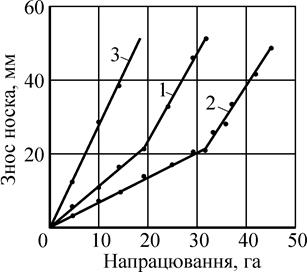 Рис. 8. Залежність зносу носка стрільчастих культиваторних лап від напрацювання: 1- серійні лапи; 2- експериментальні лапи; 3- лапи із сталі 65Г (термічна обробка – нормалізація) без наплавлення