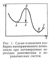 служит непрерывное увеличение потенциальной энергии активации на границе двух фаз за счет кинетической энергии, а второй неактивируемой стадии — непрерывное уменьшение термодинамического изобарного потенциала системы (диффузионная стадия).