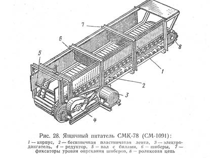 Ящичный питатель СМК-78 (СМ-1091) (рис. 28) представляет собой корпус 1, дном которого является металлическая бесконечная пластинчатая лента 2, укрепленная на двух роликовых цепях 8 и приводимая в движение через редуктор 4 электродвигателя 3. Эта лента, перемещаясь в сторону открытой части питателя, транспортирует материал к валу 5 с билами, где крупные комья частично разбиваются. К корпусу подавателя прикреплены планки, которые являются фиксаторами 7 уровня опускания шиберов. К планкам крепят металлические шиберы 6.