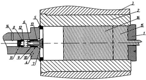 Изобретение поясняется чертежом, где показан прессовый инструмент, состоящий из матрицы 1, втулки 2, установленной в контейнере 3, пресс-штемпеля 4, прокладки с отверстием 5, клапана 6, который состоит из золотника 7, имеющего три отверстия, гаек 8, 9, 10, пружины 11, втулки 12, шпонки 13, воздушного канала 14, также показан пресс-остаток 15 и заготовка 16.