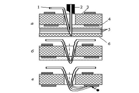 и прижимается к монтажной площадке с некоторым усилием. Под давлением происходит удаление изоляции, сплющивание провода и образование контакта. Нижний электрод 1