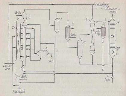 Парогазовый поток из реактора поступает в сепаратор 3 циклонного типа, куда подают воду для "закалки" продуктов реакции (их температура снижается до 290 °С). Катализатор в сепараторе 3 отделяют от продуктов реакции и в горячем состоянии возвращают в дозатор 1. Часть пара, образующегося за счет отвода выделяющегося тепла, по мере необходимости подают из паросборника 4 в сепаратор 3, а основное количество пара вводят в нижнюю часть дозатора 1. Газовый поток из сепаратора 3 после охлаждения в холодильнике (на схеме не показан) поступает в сепаратор 5, где отделяются сконденсировавшиеся вода и высококипящие продукты, а также катализатор, возвращаемый на окисление. Несконденсировавшиеся продукты реакции из сепаратора 5 после холодильника 6 поступают в газосепаратор 7, из которого парогазовый поток направляется в орошаемый водой абсорбер 8. Газ из абсорбера возвращают на окисление (часть его периодически сбрасывают в атмосферу во избежание накопления инертных примесей). Жидкие продукты из сепаратора 7 и раствор из абсорбера 8 смешивают и подают в отпарную колонну 9, с верха которой отбирают акролеин-сырец, направляемый на ректификацию, а снизу — воду, подаваемую в дозатор 1 или сбрасываемую из системы.