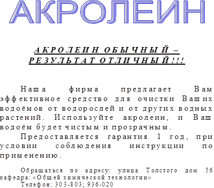 Физические свойства: акролеин - бесцветная жидкость с острым запахом. Температура кипения = С, а температура плавления = С. Плотность акролеина составляет 0,841 г/см . Акролеин частично растворим в воде. Так же он токсичен (пары его сильно раздражают слизистые оболочки глаз и дыхательных путей), но опасность отравления им сравнительно невелика вследствие легкости его обнаружения.