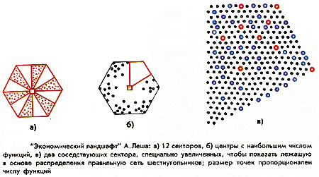В 1954 г. вышла работа немецкого экономиста А. Леша "Географическое размещение хозяйства" (в 1959г. она была переведена на русский язык), где была представлена более сложная модель размещения городов, максимально приближенная к реальному миру. А.Лешем были введены дополнительные факторы, главный из которых - общее для всех населенных пунктов данной территории центральное место: самый крупный и важный город, экономический центр всей системы населенных пунктов. Логика дальнейших рассуждений сводилась к следующему: сетки распределения с К=3,4,7 и вращали их вокруг общего центрального места, чтобы добиться совпадения максимально возможного числа центров при К=3, К=4, К=7. Это позволило оптимизировать все три структуры сразу - рыночную, транспортную и административную.