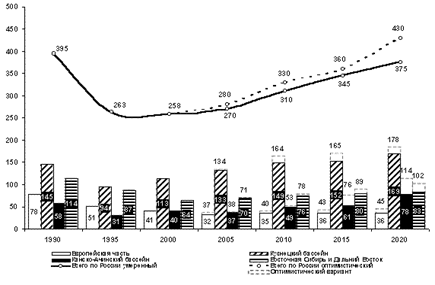 Прогнозируемые объёмы добычи угля в стране, как и других энергоресурсов, будут различаться в зависимости от того или иного варианта социально-экономического развития России, однако при всех вариантах предусматриваются более высокие темпы роста потребления угля по сравнению с другими видами органического топлива. При оптимистическом и благоприятном вариантах развития добыча угля в России может составить 300 - 330 млн. т в 2010 году и возрасти до 400 - 430 млн. т к 2020 году (рис.1). При умеренном и критическом вариантах развития добыча угля в стране составит 270 - 310 млн. т в 2010 году и 300 - 375 млн. т в 2020 году.