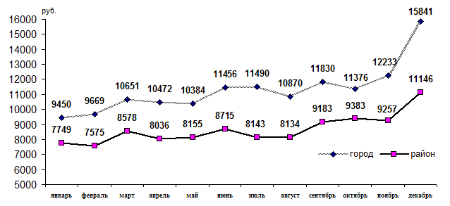начисленная работникам крупных и средних предприятий (без предприятий малого бизнеса) в декабре 2007года по городу сложилась в размере 15841 рубль, в районе – 11146 рублей и увеличилась по сравнению с ноябрем 2007 года на 29,5% по городу, в районе - на 20,4%. Средняя месячная заработная плата за 2007г. по городу составила 11291 рубль, что на 23,5% больше, чем 2006г. По району - 8659 рублей (на 21,2% больше).