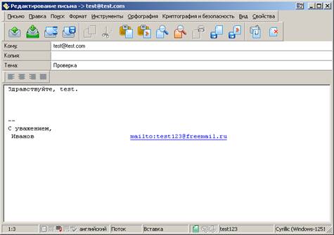 2. В поле «Кому» указываем test@test.com, в поле «Тема» – тему письма (например, «Проверка»), в области для текста письма набираем с клавиатуры сообщение для адресата.