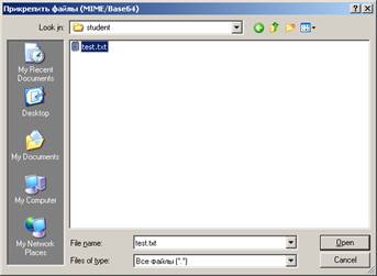3. Кликаем мышью по кнопке «Прикрепить файл» (или нажимаем Alt + PageUp). В появившемся диалоге открытия файла находим и выбираем файл