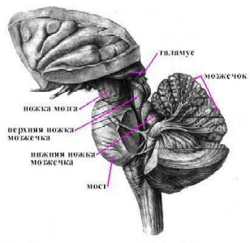 Мозжечок расположен дорсально от моста и продолговатого мозга. В нем выделяют два полушария и среднюю часть - червь. Поверхность мозжечка покрыта слоем серого вещества (кора мозжечка) и образует узкие извилины, разделенные бороздами. С их помощью поверхность мозжечка делится на дольки. Центральная часть мозжечка состоит из белого вещества, в котором заложены скопления серого вещества - ядра мозжечка. Самое большое из них - зубчатое ядро. Мозжечок связан с мозговым стволом тремя парами ножек: верхние соединяют его со средним мозгом, средние - с мостом и нижние - с продолговатым мозгом. В них проходят пучки волокон, соединяющих мозжечок с различными частями головного и спинного мозга.