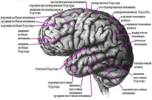 Ими пользуются для разделения полушарий на большие участки, называемые долями. Каждое полушарие делят на пять долей: лобную, теменную, затылочную, височную и скрытую долю, или островок, расположенный в глубине боковой борозды. Границей между лобной и теменной долями является центральная борозда, между теменной и затылочной - теменно-затылочная. Височная доля отделена от остальных боковой бороздой. На верхнелатеральной поверхности полушария в лобной доле различают предцентральную борозду, отделяющую предцентральную извилину, и две лобные борозды: верхнюю и нижнюю, делящие остальную часть лобной доли на верхнюю, среднюю и нижнюю лобные извилины.