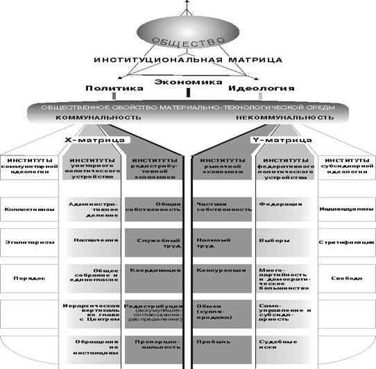 Теория институциональных матриц базируется на определенном представлении об обществе, поэтому именно общество составляет вершину "дерева" понятий, его исходный пункт. Далее это представление разворачивается, т. е. конкретизируется. Свойственные Х и Y-матрицам комплексы базовых политических институтов в концентрированной форме выражают различия между двумя альтернативными типами политического устройства. Сколь угодно много ни рассматривали бы мы конкретных политических систем, в конечном счете, они характеризуются доминированием либо первого, либо второго комплекса политических отношений.