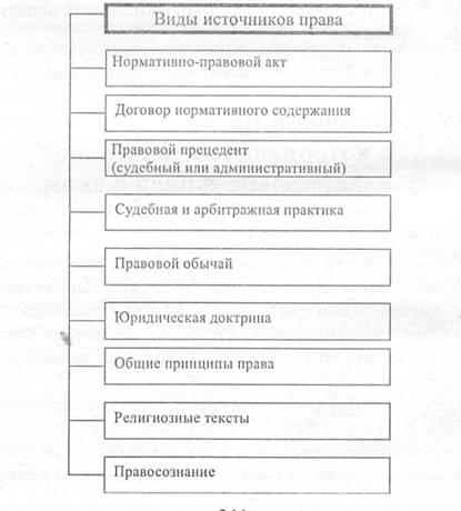 В различных государствах, а также в каждом отдельно взятом государстве, позитивное право может приобретать самые разные формы своего внешнего выражения. Следовательно, могут существовать и разные юридические источники права. Ими могут быть санкционированные государственной властью обычаи, юридические (судебные или административные) прецеденты, правовая доктрина, нормативные договоры, нормативные правовые акты и т.д. Наиболее распространенными, начиная с древнейших времен, являются санкционированные обычаи, юридические прецеденты, нормативные договоры и нормативные правовые акты. Это дает отдельным авторам основание рассматривать данные формы и источники права в качестве основных, что, на наш взгляд, является не совсем правильным. Санкционированные обычаи, юридические прецеденты, нормативные договоры и нормативные правовые акты можно рассматривать в качестве основных форм и источников права лишь в сопоставлении с другими формами (источниками) права и безотносительно к конкретным государствам. Что же касается конкретных государств, то в них существуют свои основные и неосновные формы (источники) права. Причем к неосновным могут относиться и те, которые причисляются к разряду основных. Например, в нашей стране основными формами (источниками) права являются только нормативные правовые акты. Санкционированные же обычаи и нормативные договоры считаются уже неосновными формами (источниками) права, а юридические прецеденты в их классическом виде отсутствуют вообще.