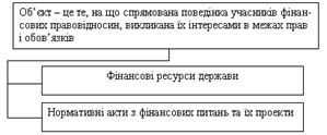 Під об'єктом фінансових правовідносин слід розуміти те, на що направлена поведінка учасників фінансових правовідносин. Об'єктом є гроші або грошові зобов'язання у зв'язку з утворенням і використанням грошових фондів.