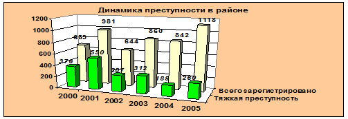 Из проведенного анализа оперативной обстановки по Советскому району видно, что динамика преступности не имеет определенной стабильности, как и в целом по России. Как видно на рис. 1.1 число зарегистрированных преступлений в 2005 году, по сравнению с периодом 2000–2005 г.г., возросло. Однако на фоне роста общего числа зарегистрированных преступлений, видно снижение числа зарегистрированных тяжких преступлений.