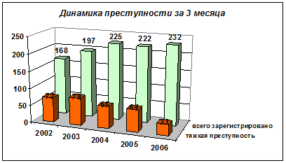 На рисунке 1.2. видно, что к концу квартала на территории района наметилась тенденция количественного роста регистрируемой преступности. За 3 месяца 2006 года зарегистрировано 232 преступления, что на 10 фактов больше (+4,5%), чем за аналогичный период прошлого года (по округу +15,9%). Также видно снижение числа зарегистрированных тяжких преступлений.
