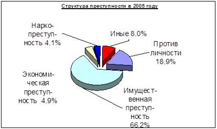 Наибольший процент из общего числа совершенных преступлений (за 2005 г.) занимает преступления имущественного характера (кражи, мошенничества, грабежи, разбои и т.д.), значительно меньший процент занимают преступления против личности (убийство, доведение до самоубийства, умышленное причинение различной степени вреда здоровью, неоказание помощи больному, заражение ВИЧ-инфекцией и т.д.), практически на одном уровне находятся экономические преступления и преступления в сфере незаконного оборота наркотических и психотропных веществ.