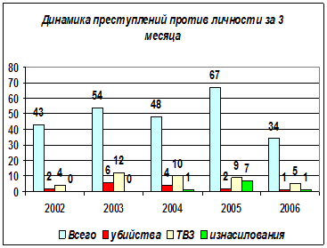 Рассмотрим более детально динамику преступлений против личности. На рисунке 1.4. приведен анализ данного вида преступлений за первые кварталы 2002 – 2006 г.г. из чего видно, что наибольшее количество убийств было совершено в первом квартале 2003 года, а наибольшее количество изнасилований было совершены в первом квартале 2005 года, в этот же период было зарегистрировано наибольшее число совершенных преступлений против личности.