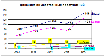 В истекшем году темпы увеличения имущественных преступлений (см. рис. 1.6.) достигли двух третей (+61,2%), что за последние 5 лет является наибольшим показателем (2002 г.: +44,2%;2003г.: +53,9%; 2004 г.: +1,8%).