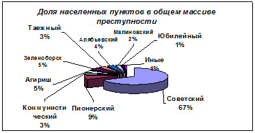 Как видно на приведенном ниже рисунке 1.7. наибольшее количество преступлений совершается в г. Советский. Это связано в первую очередь с тем, что в Советском проживает 52% населения всего района.