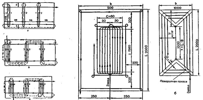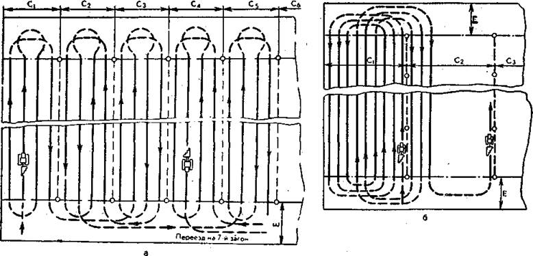 Рис. 5. Схема движения агрегата при работе петлевым способом с чередованием загонов (а) и беспетлевым комбинированным способом (6): С1