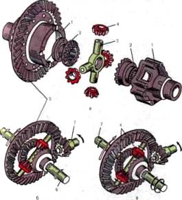 1 — корпус; 2 — шестерня піввісі; 3 — хрестовина; 4 — сателіт; 5 — ведена шестерня головної передачі; 6 — піввісь, 7 — ведуча вал-шестерня головної передачі