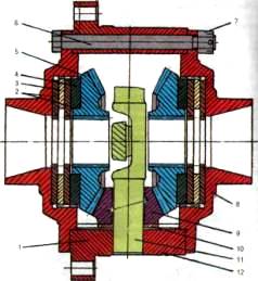 1 — коробка диференціала ліва; 2 — диск тертя ведучий; 3 — диск тертя; 4 — диск тертя центруючий; 5 — муфта напівосі; 6 — гвинт диференціала; 7 — гайка; 8 — фланець коробки диференціала; 9 — сателіт з втулкою; 10 — шайба; 11 — палець диференціала; 12 — коробка диференціала права