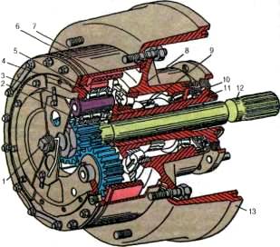 1 — пробка; 2 — сонцева шестерня; 3 — палець (вісь); 4 — сателіт; 5 — водило; 6 — коронна шестерня; 7 — корпус; 8 — картер; 9 — перехідний фланець; 10 — ущільнення; 11 — маточина; 12 — піввісь; 13 — диск ведучого колеса