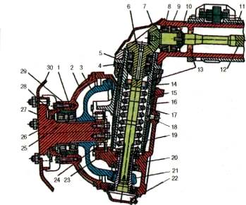 1 — стакан підшипника; 2 — кришка редуктора; 3 — ведена шестерня; 4 — стакан ущільнення; 5,29 — регулювальні прокладки; 6 — вертикальний вал; 7,22 — кришка; 8,26 — підшипник; 9 — розпірне кільце; 10 — гайка; 11 — корпус верхньої конічної пари; 12 — піввісь; 13 — манжети; 14 — обойма манжети; 15 — ущільнювальне кільце; 16 — гільза шворня: 17 — труба шворня; 18 — штифт; 19 — пружина; 20 — корпус редуктора; 21 — ведуча шестерня; 23 — стакан; 24 — опорна шайба; 25 — регулювальне кільце; 27 — фланець-маточина; 28 — корпус манжети; 30 — диск колеса