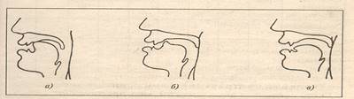 При произнесении гласных первой и второй групп передняя часть языка поднята по направлению к альвеолам и твердому нёбу.