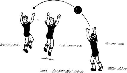 Дети делятся по трое. Двое из них располагаются друг против друга на расстоянии 3—4 м и перебрасывают мяч между собой. Третий становится между ними и старается поймать мяч или хотя бы коснуться его рукой. Если это удается, он меняется местами с тем, кто бросил мяч (рис. 37). Можно предложить детям перед броском выполнить какое-либо движение: бросить мяч вверх, вниз, поймать его, вести мяч на месте и т. д.