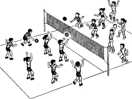 Дети образуют две равные команды. Каждая из них берет по нескольку мячей и располагается на своей половине площадки (площадка разделена сеткой, подвешенной на уровне 130—150 см).Дети обеих команд после сигнала воспитателя стараются перебросить свои мячи на площадку противника. Выигрывает команда, на площадке которой после второго свистка находится меньше мячей (рис.38).