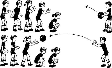 По сигналу воспитателя капитан передает мяч первому игроку колонны, который ловит его, передает обратно капитану и приседает (рис. 39). Капитан таким же образом передает мяч второму, затем — третьему и всем остальным игрокам. Каждый игрок после передачи мяча капитану приседает. Когда мяч передан капитану последним игроком, капитан поднимает мяч вверх над головой и вся команда быстро встает. Выигрывает та команда, которая раньше выполнила задание. Если игрок не поймал мяч, то он обязан за ним сбегать, вернуться на свое место и передать мяч капитану Перестрелка.