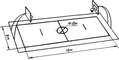 Площадка для обучения игре в баскетбол должна быть покрыта твердым грунтом (утрамбованной землей или асфальтом). Однако лучше всего площадки с деревянным покрытием: их легко содержать в порядке, они быстро сохнут после дождя, от них хорошо отскакивает мяч (рис.40).(Все размеры площадки даны на рисунке 41, а.)