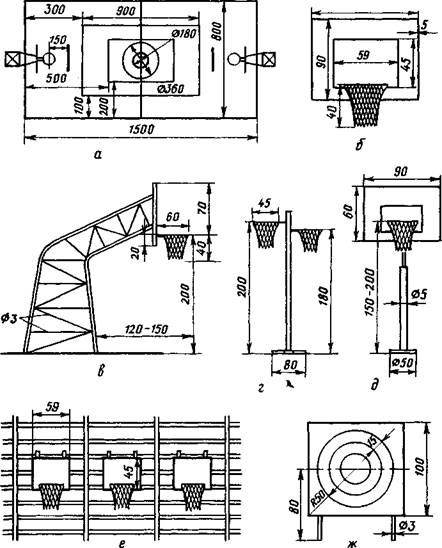 Корзины по размерамдолжны соответствовать стандартамвнутренний диаметр 45см, длина сетки 40см. Их подвешивают не ниже 180см и не выше 20см над уровнем площадки. Щиты размером 120X90 см делают из целого прочного дерева, поверхность окрашивают белым цветом, а края обводят линией шириной в 5см (рис41, б).Окантовку щитов желательно делать не черной краской, а яркой, веселой (красной, голубой). Стойку, к которой крепятся щиты, следует выносить на 1 — 1,5м от лицевой линиив целях предупреждения травм у детей. Виды стоек и типыкрепления корзины см. на рисунке 41(в — е).