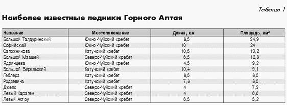 В горах Алтая более 1330 ледников общей площадью около 900 км2. По количеству ледников и площади оледенения (около 1% от всей территории) Алтай уступает в России лишь Кавказу, а в странах СНГ — Памиру. Самый длинный — ледник Сапожникова (табл. 1), расположенный на Катунском хребте, который занимает первое место по количеству ледников и площади оледенения на Алтае.