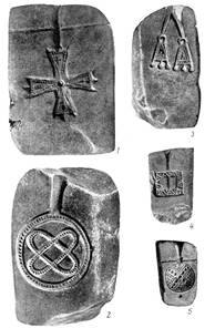 Рис. 2. Клейма на днищах керамических сосудов и «знак рюриковичей»