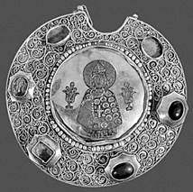 Рис. 8. Золотой колт с изображением князя Глеба. Филигрань, перегородчатая эмаль. 12 в.