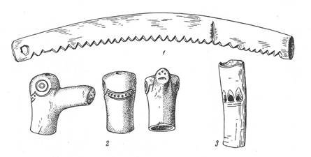 1 – счетная бирка; 2 – рукоять плети; 3 – костяная трубочка с тремя отверстиями
