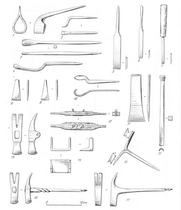 Рис. 12. Деревообрабатывающий инструмент: резцы, стамески, гвоздодеры