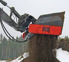 Ковш-сортировщик (просеивающая дробилка) - запатентованное многофункциональное устройство, предназначенное для просеивания и погрузки различных материалов (земли, древесины, железобетона, кирпичей, стекла). В случае с мягкими материалами выполняет также функцию дробления.