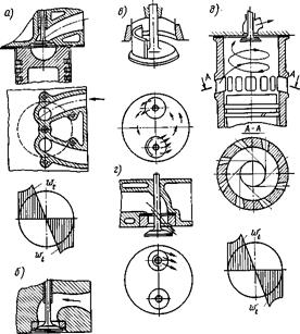 определяется типом и размерами дизеля, существенно влияет на продолжительность и давление впрыскивания и ограничена условиями обеспечения хорошего смесеобразования и тепловыделения. Поэтому при большом числе сопловых отверстий их диаметр должен быть небольшим. Изготовить точно отверстия малого диаметра трудно. Сложна также эксплуатация дизеля с распылителями, имеющими малый диаметр сопловых отверстий. В частности, интенсивнее происходит уменьшение проходного сечения сопловых отверстий из-за отложения на их поверхности кокса, поэтому целесообразно применение меньшего числа отверстий, чем это следует из условия полного охвата струями объема камеры сгорания. При этом для обеспечения полного сгорания топлива воздух приводится во вращательное движение тем более интенсивно, чем меньше число сопловых отверстий, так как в этом случае заряд за характерный промежуток времени, принимаемый обычно равным продолжительности впрыскивания топлива, должен повернуться на больший угол. Достигают этого применением винтового или тангенциального впускного каналов, а также экранированием впускного клапана или его седла (рис. 1, а-г).