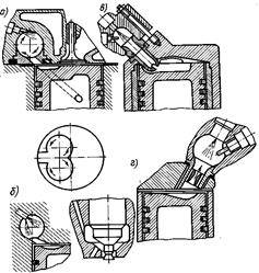 Рис. 3 - Разделенные камеры сгорания: а - вихревая (на верхней проекции показано направление перетекания заряда из основной полости в вихревую камеру при сжатии, на нижней - из вихревой камеры в основную при расширении); б - вихревая и распылитель типа «Пннтакс» со вспомогательным пусковым распиливающим отверстием; в - предкамера; г - предкамера малого перепада давления дизеля MWM