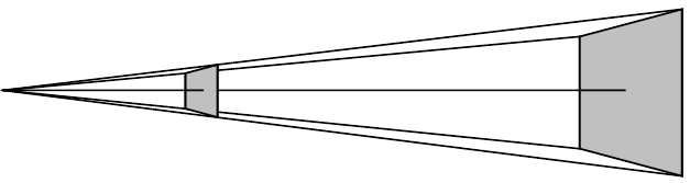 Вследствие уменьшения гравитации с расстоянием этот закон часто называют законом обратной пропорциональности квадрату расстояния. Таким законом описываются многие явления природы. Например, он справедлив и для освещенности, создаваемой светящимся телом. Если смотреть на лампочку мощностью 100 Вт с расстояния 5 м, то она кажется очень яркой. Та же лампочка с расстояния 50 м выглядит тусклой. Рассмотрим фиксированную площадку, расположенную перпендикулярно направлению световых лучей (рис. 1). Если расстояние до источника света увеличить в 10 раз (с 5 до 50 м), то количество света, падающего в секунду на эту площадку, в 100 (10 2