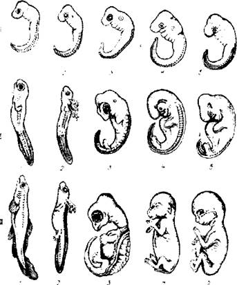 Дарвин усматривал здесь общность происхождения. Но решающий вклад в утверждение этого закона внес Геккель, который ретушировал рисунки, иллюстрирующие общность строения эмбрионов собаки и человека и был уличен в этом.