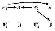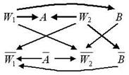 Ответ очевиден: в разных предложениях одно и то же словосочетание «некоторые грибы» могут обозначать разные виды грибов, но при формализации эти, возможно, разные виды грибов мы обозначили одним и тем же символом W. Отсюда ясно, что при повторении в разных посылках одинаковых словосочетаний «некоторые X» мы должны обозначать их разными символами. Посмотрим, что получится в этом случае. Пусть даны посылки W1®(A, B); W2®(A, ). Построим для них стрелочную диаграмму (рис. 1) и все возможные следствия из этих посылок (рис. 2).
