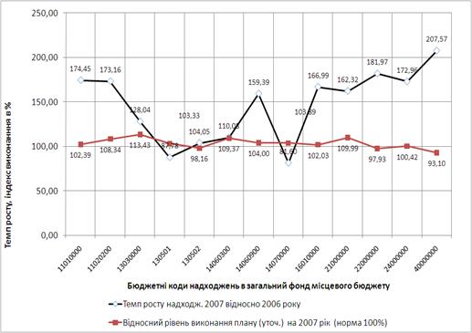 Рис.3.4. – Динаміка темпів росту та рівня виконання плану постатейних доходів в загальний фонд міського бюджету м.Дніпропетровська у 2007 році